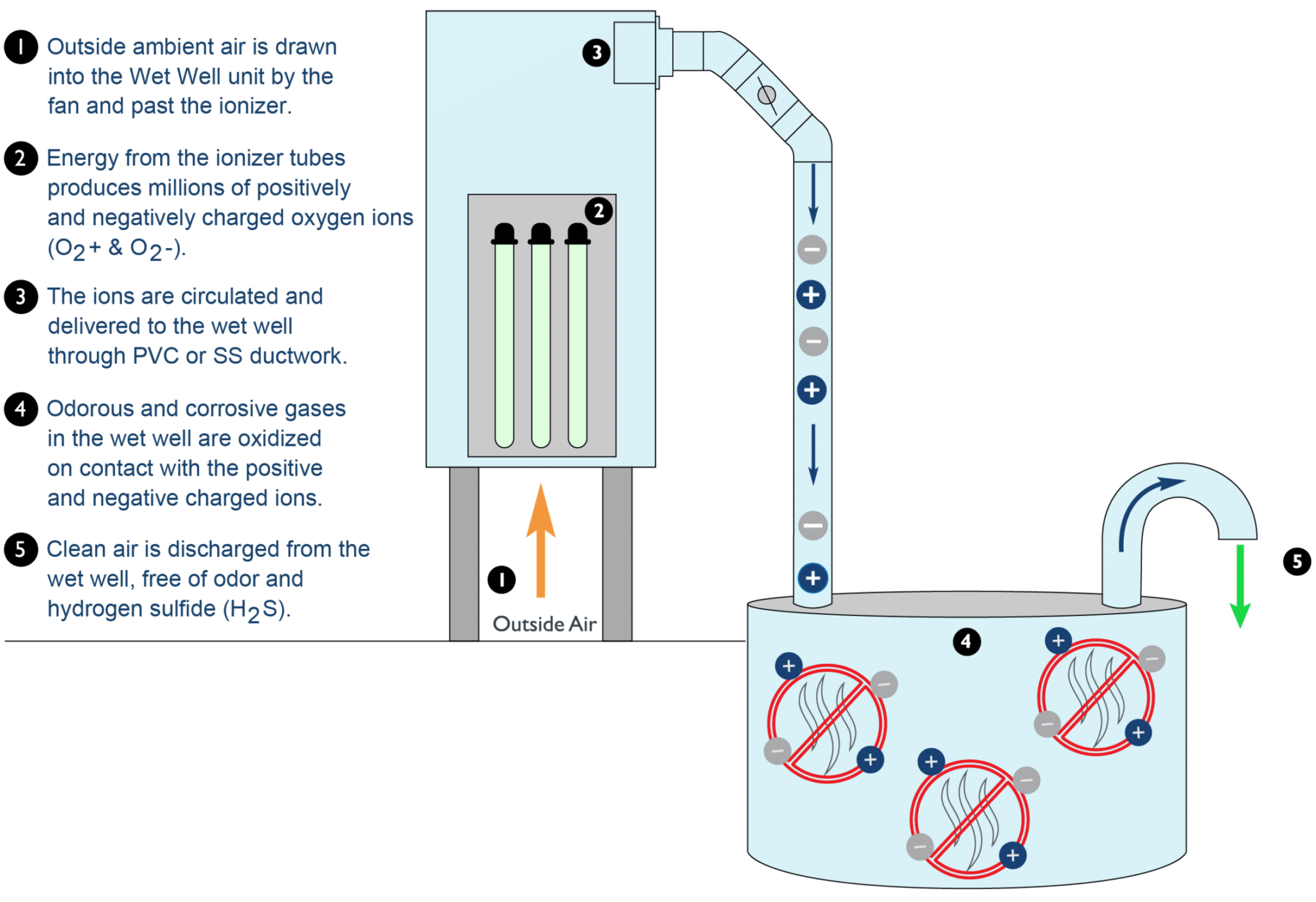Foul-smelling air escaping from pump stations, wet wells, manholes, interceptors and holding tanks can interrupt and disturb everyday life. Using Air+ bipolar ionization technology, the Odor Beast controls odors that impact the lives of those living and working nearby. The unit is designed to treat the head space in a tank, making it an ideal solution for:
